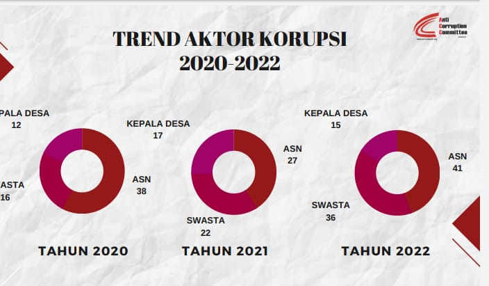 Jumlah ASN aktor korupsi tahun 2022 melonjak dibandingkan tahun 2021 yaitu 27 ASN sebagai terdakwa.