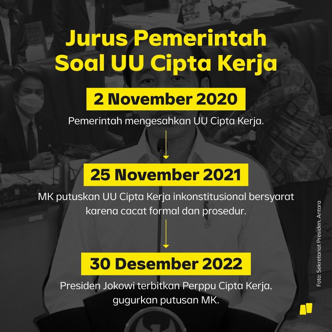 Setelah produk legislasi dinyatakan inkonstitusional oleh MK karena mengingkari aspirasi demokrasi, Presiden Jokowi mengambil jalan pintas membentuk Perppu tanpa perubahan berarti, karena hanya ditujukan untuk melegalisasi keberlakuan UU Cipta Kerja. Akumulasi kekuasaan yang dipupuk dalam sistem presidensial di satu sisi, dan sistem legislasi yang rapuh, telah memberikan kekuasaan absolut pada Presiden.