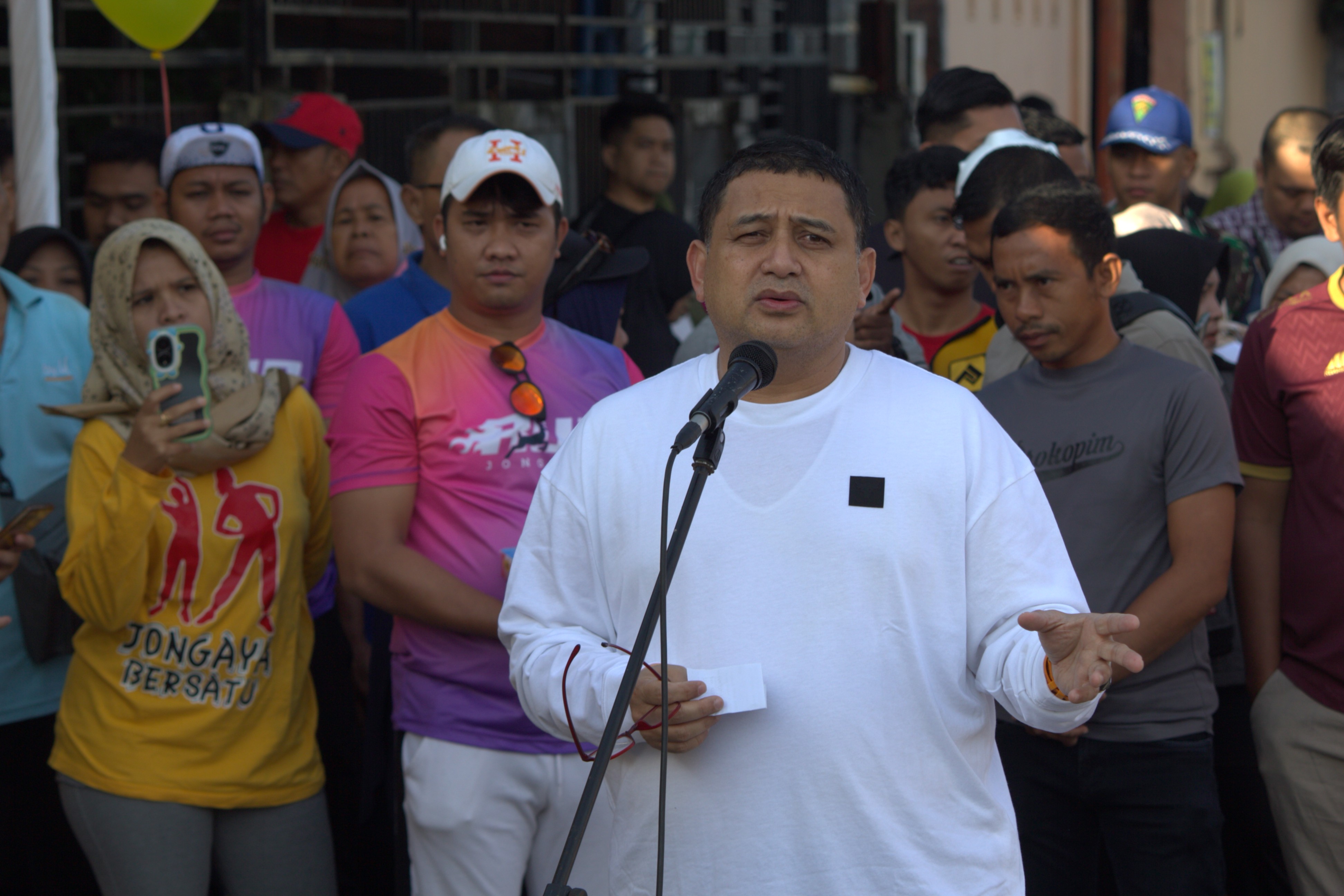 Wali Kota Makassar Munafri Arifuddin, menghadiri launching penataan Kanal Jongaya melalui pengerukan yang dirangkaikan dengan kerja bakti massal dan penanaman pohon, di RW 2/RW 13, Kelurahan Jongaya, Tamalate, Jumat (18/7/2025). @Jejakfakta/Nurdin Amir