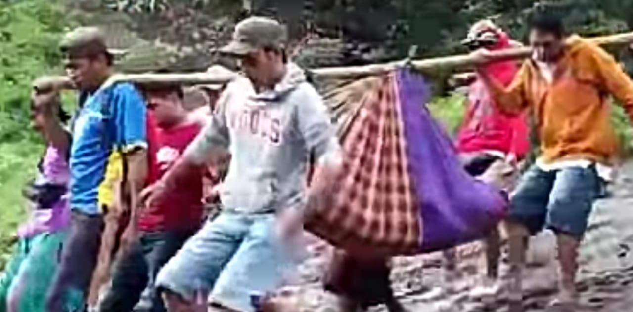 Ya, warga harus bahu-membahu menandu Asmia dengan sarung, naik turun gunung terjal, menyeberangi sungai, sejauh 7 kilometer.