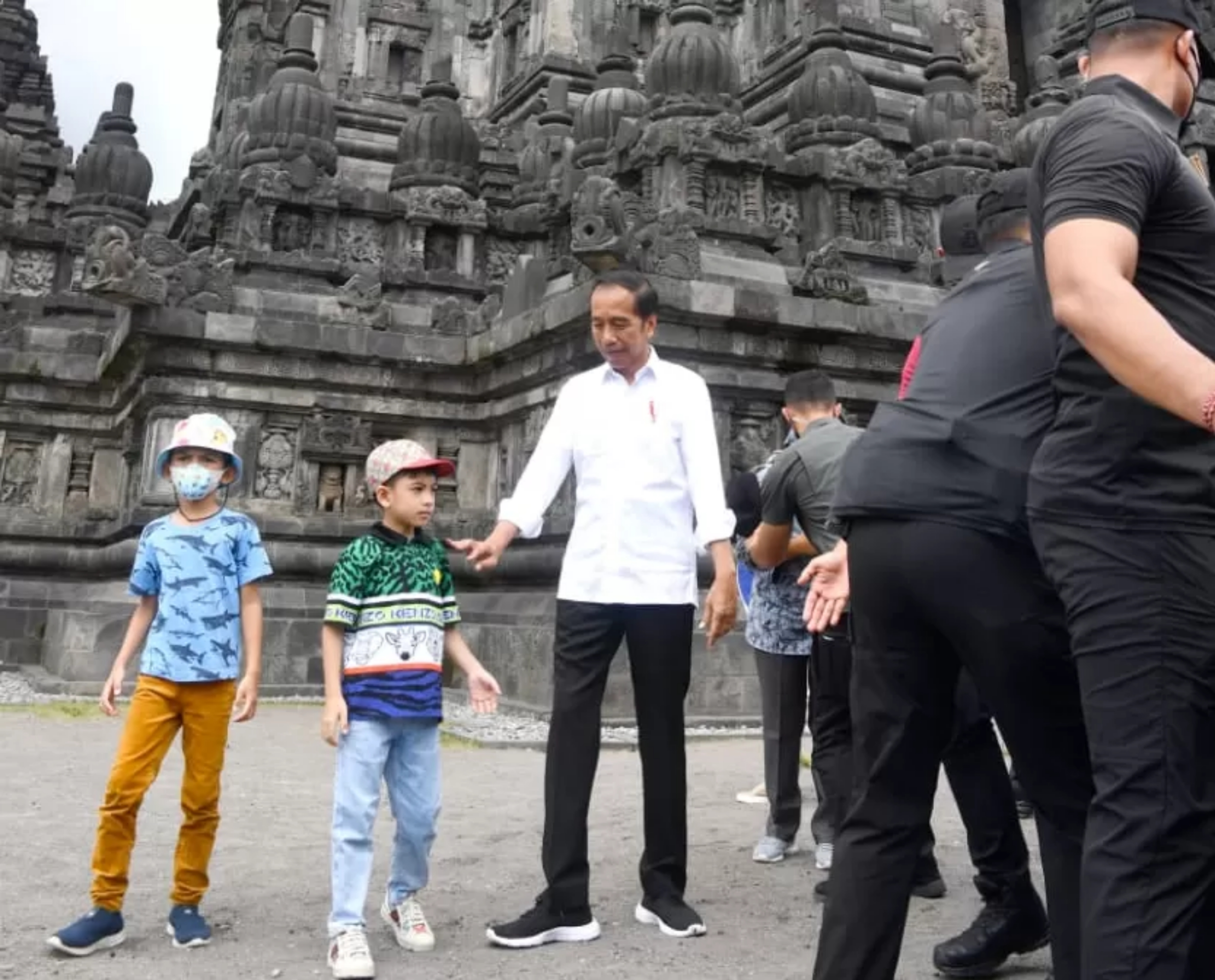 Presiden RI Joko Widodo (Jokowi) dan Ibu Negara Iriana menghabiskan akhir pekan dengan mengajak cucunya untuk berwisata edukasi ke Taman Wisata Candi Prambanan, Kabupaten Sleman, Provinsi Daerah Istimewa Yogyakarta (DIY), pada Sabtu (07/01/2023).