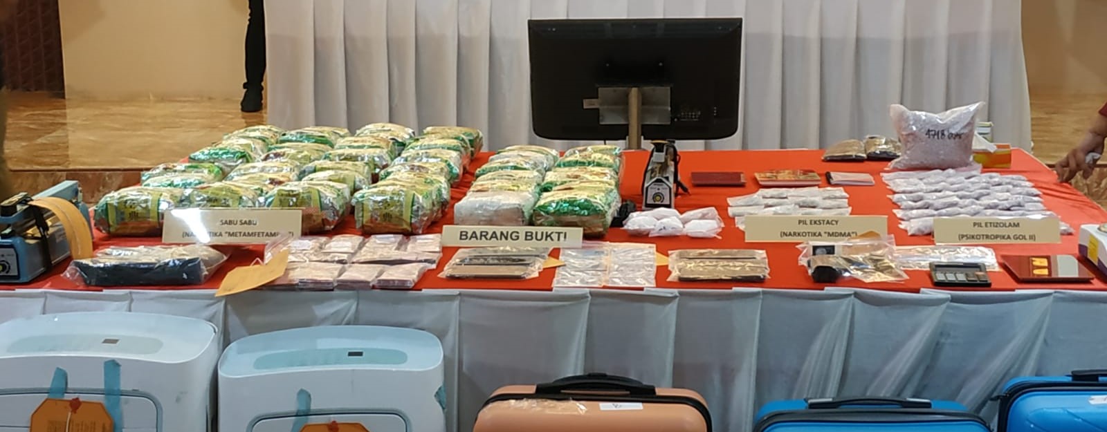 "Barang bukti narkotika sabu 43.609,4219 gram (43,6 Kg), 1.891 butir pil berlogo channel, dan 9.577 butir pil Etizolam berlogo monyet. Selain itu uang Rp103.405.000," bebernya.