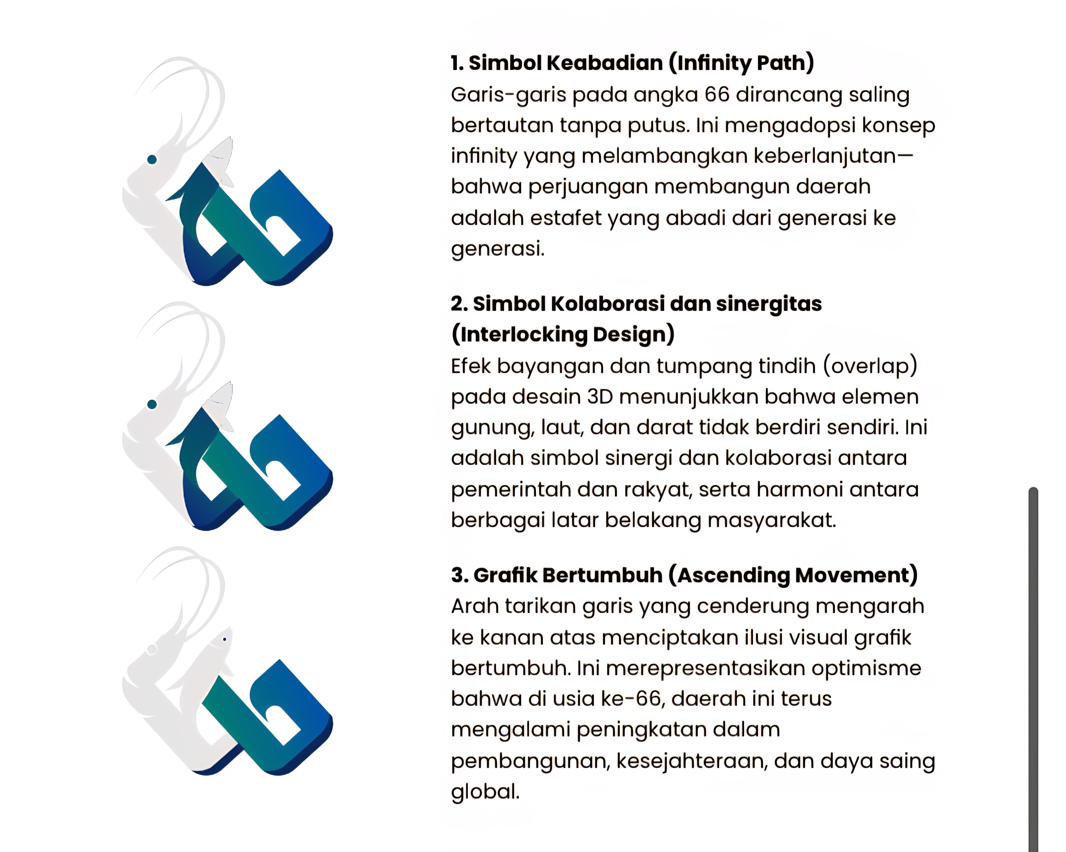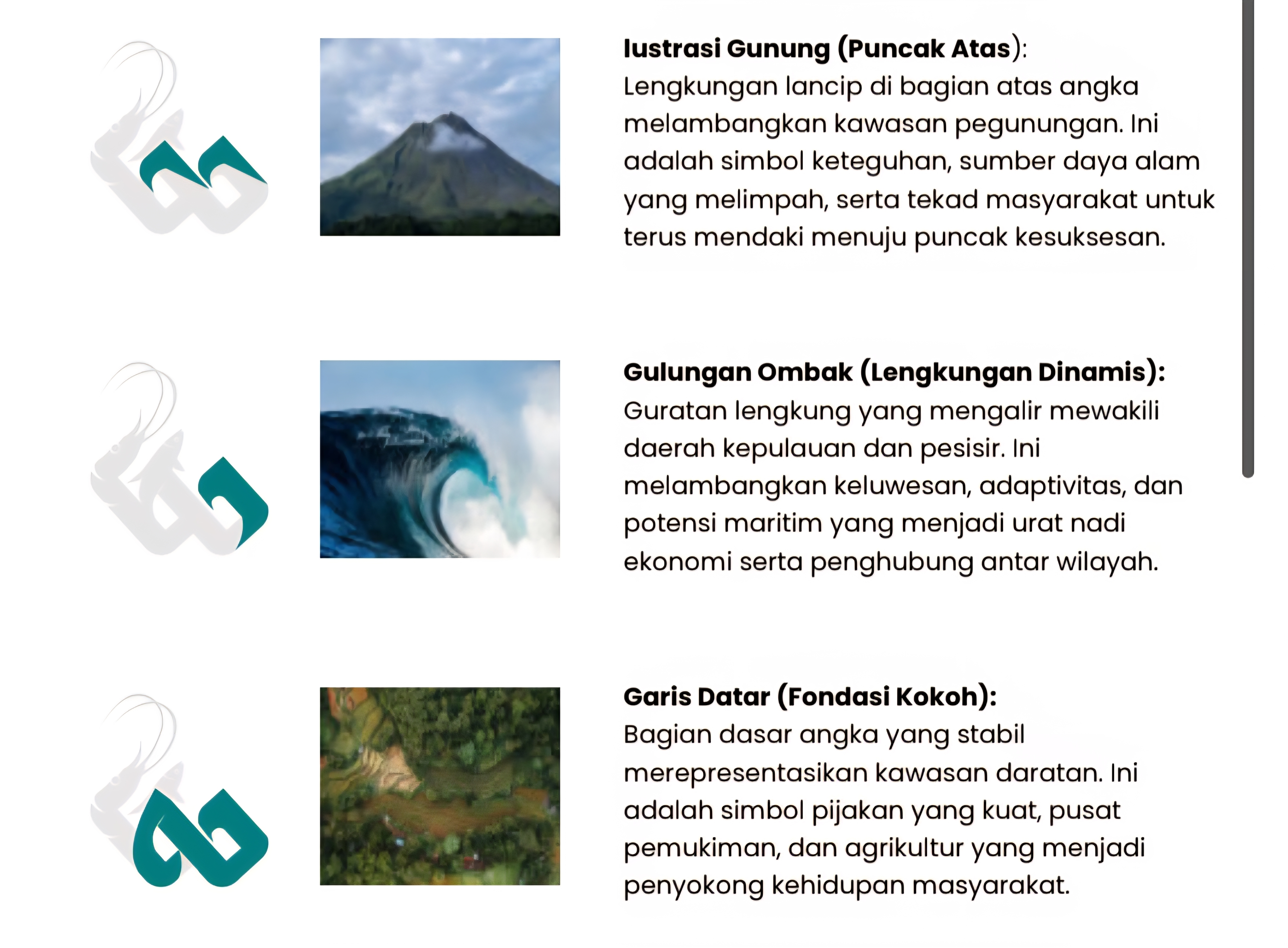 · Simbol Kolaborasi (Interlocking Design): Efek bayangan dan tumpang tindih (overlap) pada desain 3D menunjukkan sinergi antara elemen gunung, laut, darat, serta harmoni antara pemerintah dan masyarakat.