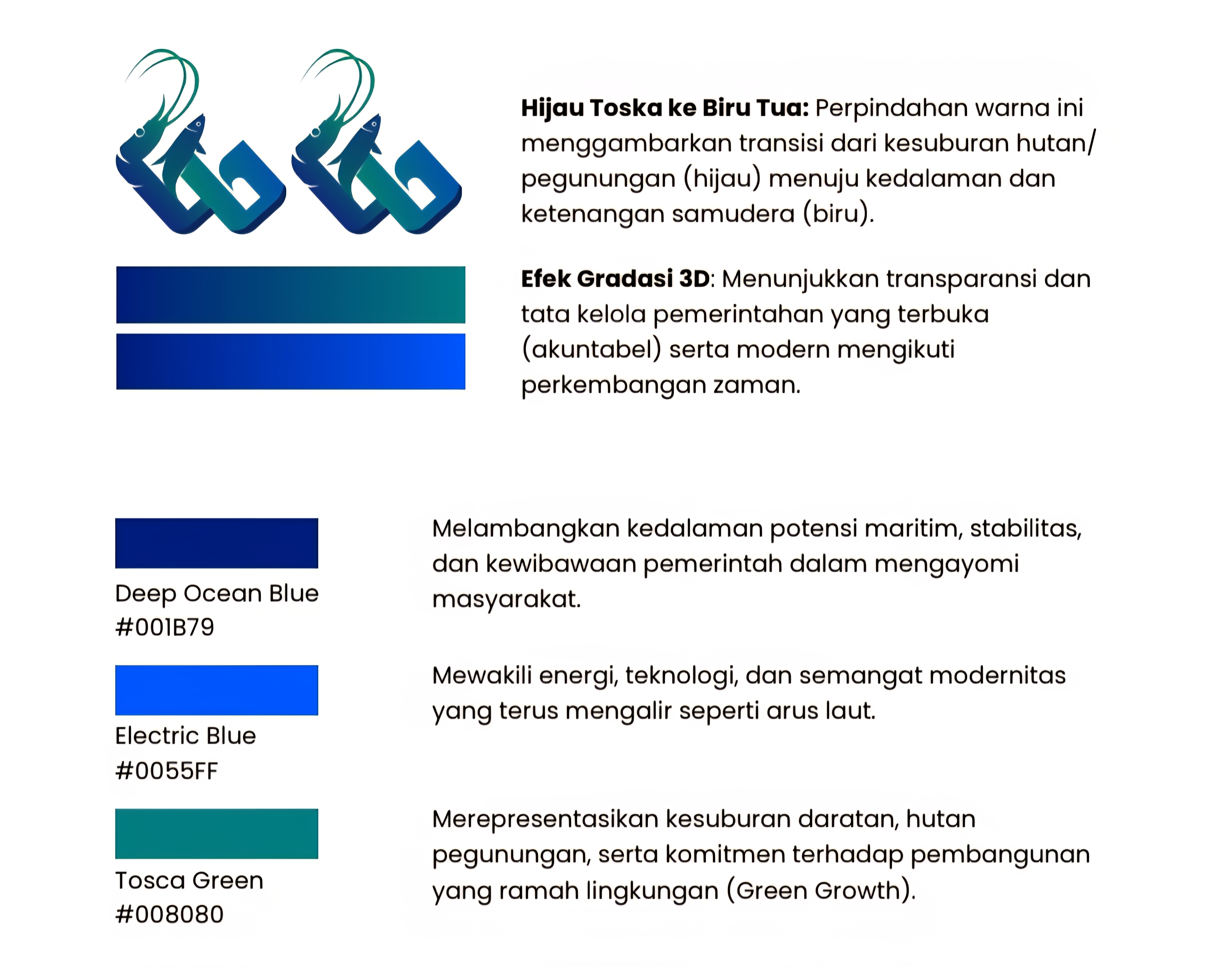 · Biru Laut Dalam: Melambangkan kedalaman potensi maritim, stabilitas, dan kewibawaan pemerintah dalam mengayomi masyarakat.