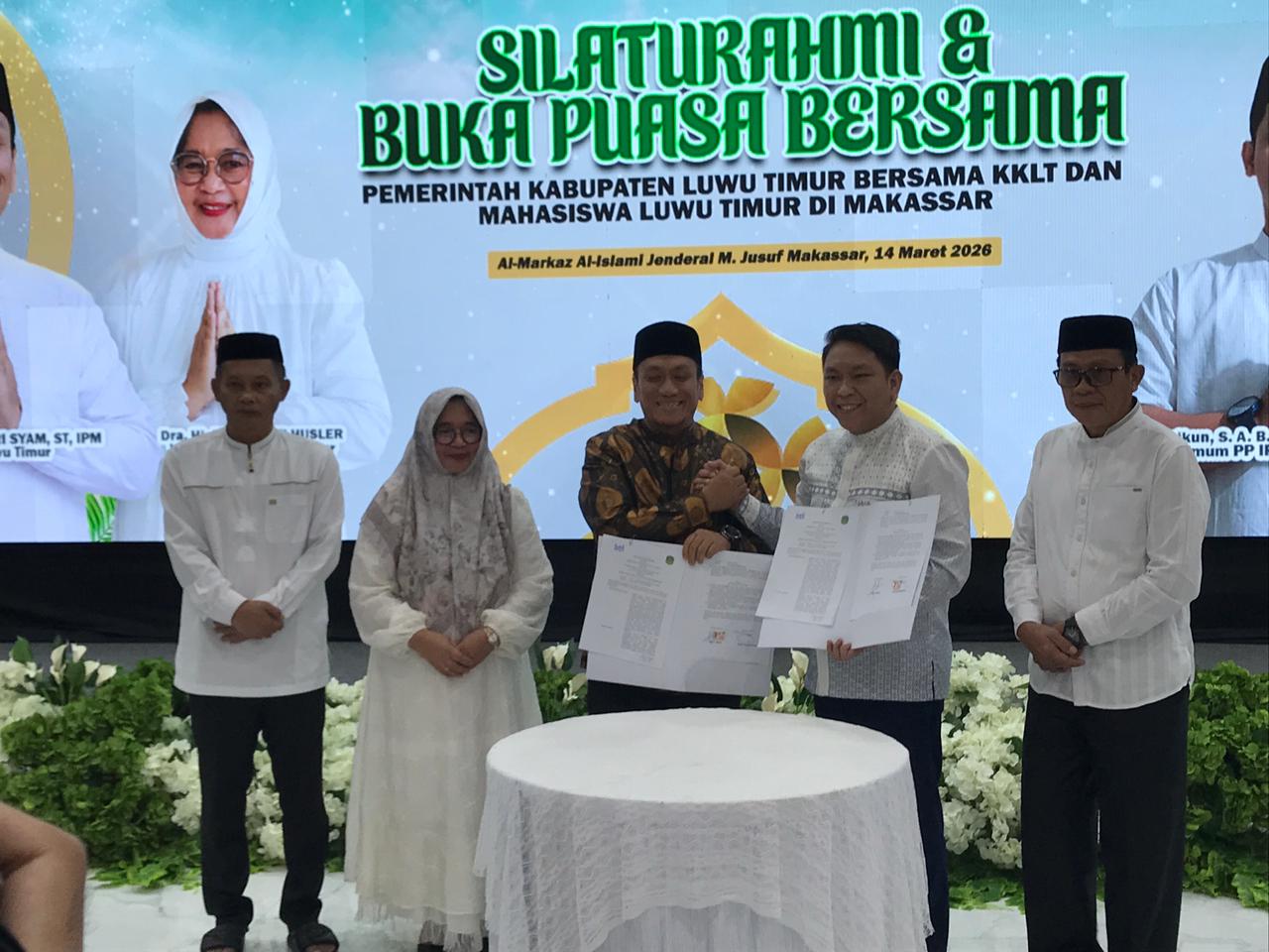 Penandatanganan nota kesepahaman (MoU) antara Pemerintah Kabupaten Luwu Timur dan Bank BTN Kanwil Sulawesi dan Papua, disela kegiatan silaturahmi dan buka puasa bersama Kerukunan Keluarga Luwu Timur (KKLT) serta mahasiswa asal Luwu Timur, di Masjid Al Markas Al Islami, Makassar, Sabtu (14/3/2025). @Jejakfakta/Wendy Adytya Lukman
