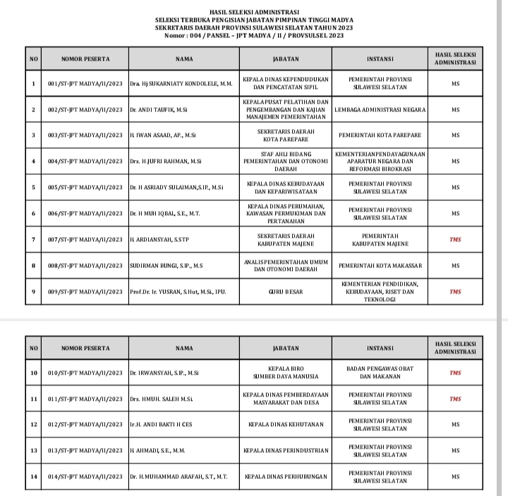 Pada Pengumuman Nomor : 004 / PANSEL – JPT MADYA / I I / PROVSULSEL 2023, dilampirkan nama-nama pendaftar atau peserta lelang jabatan Sekda Provinsi Sulsel yang memenuhi sayat (MS) dan tidak memenuhi syarat (TMS) yang ditandatangani Ketua Panitia Seleksi Prof Murtir Jeddawi.