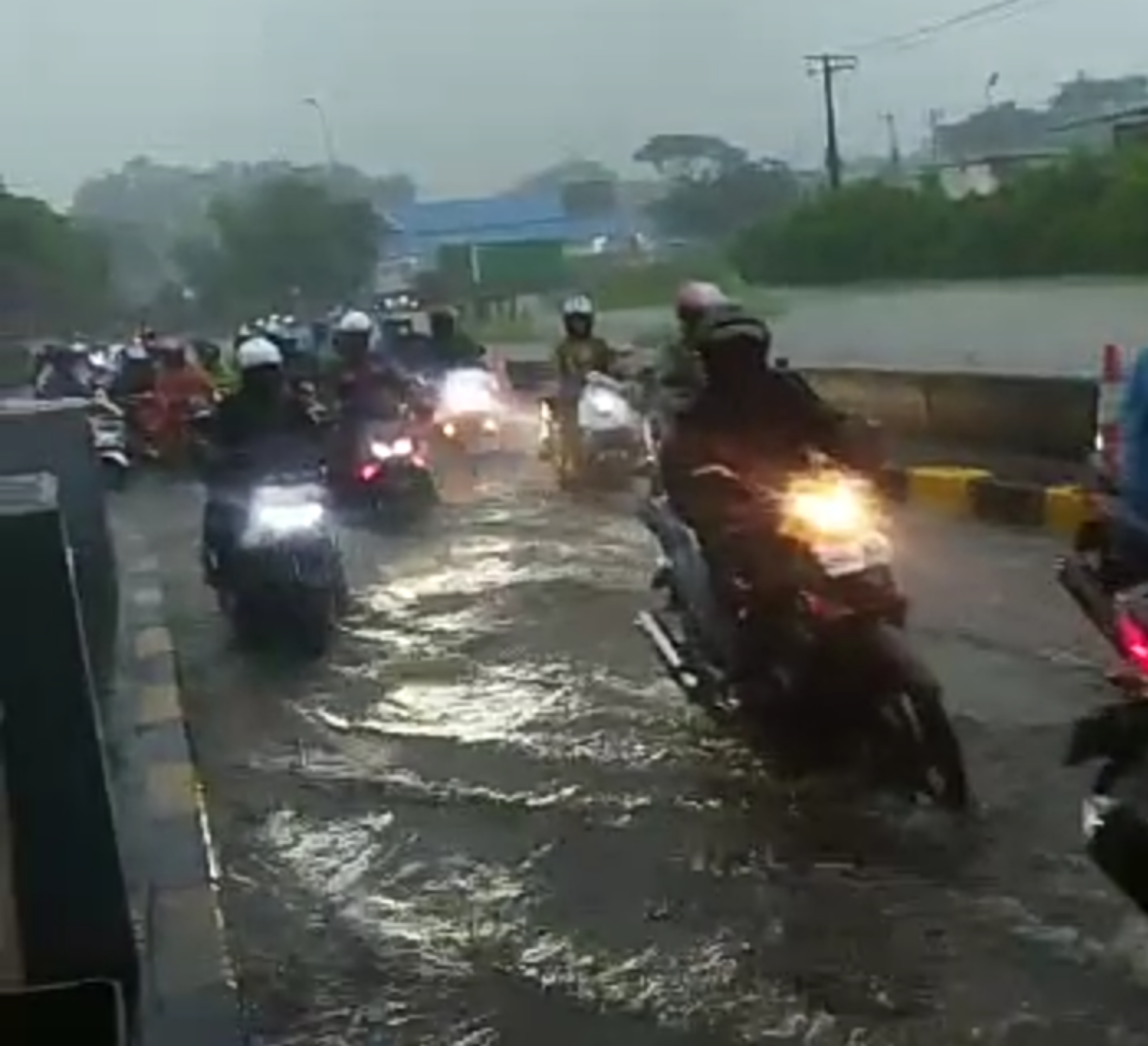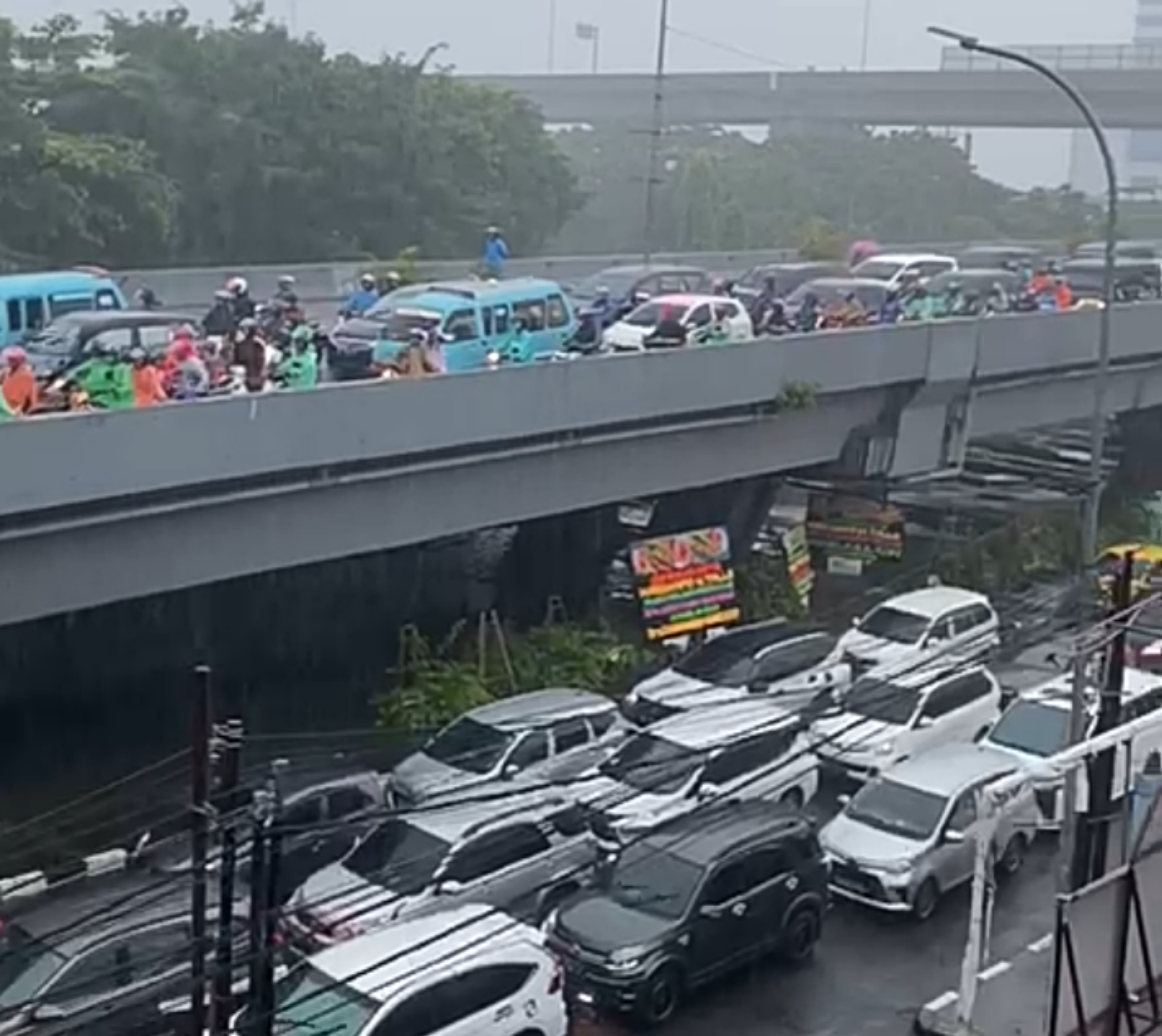 Upaya warga terekam sempat diadang oleh petugas tol dan palang gerbang tol. Kemudian pengendara motor melintas di tengah tol yang juga terendam banjir di atar mata kaki.