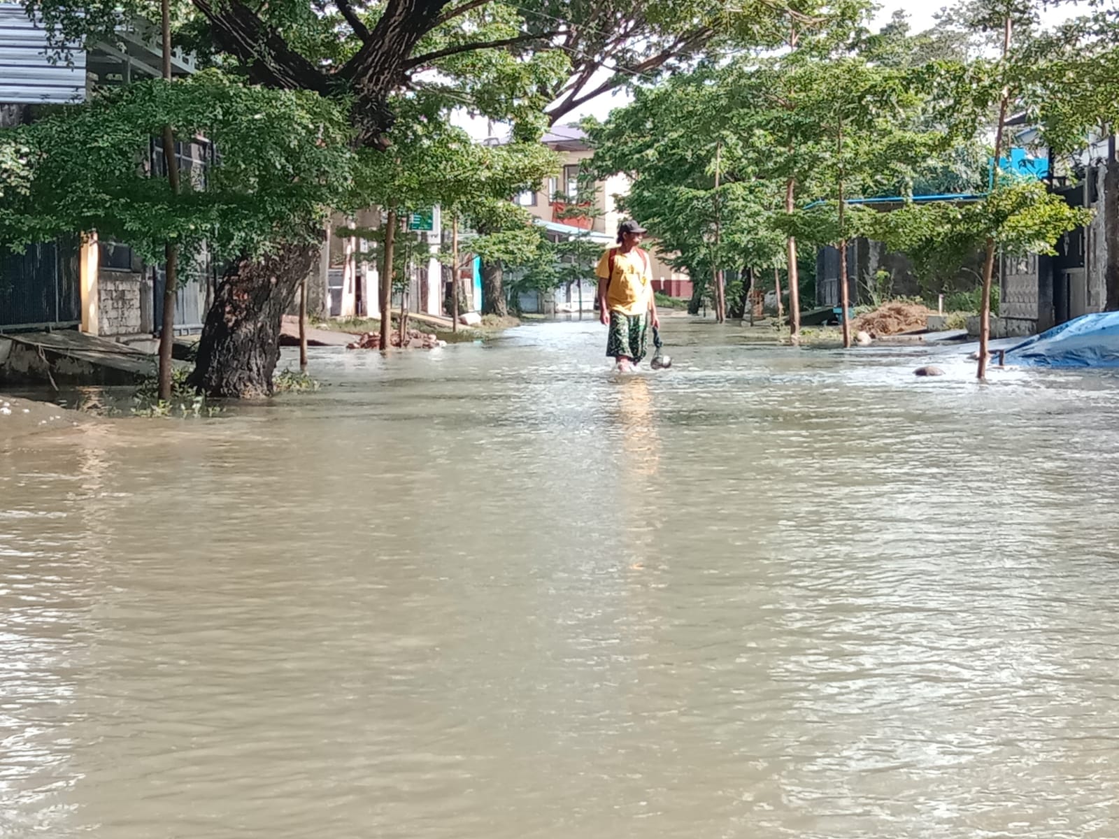 Penulis mencoba ke tempat pengungsian dengan berjalan kaki di tengah-tengah air yang merendam jalanan di Blok X (sepuluh).