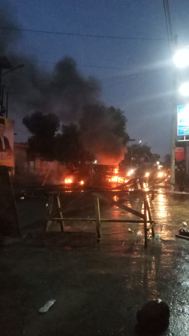 Mereka membakar ban dan balok kayu di tengah jalan poros itu. Praktis, lalu lintas lumpuh. Aksi massa mulai sejak pagi hingga petang, Sabtu.