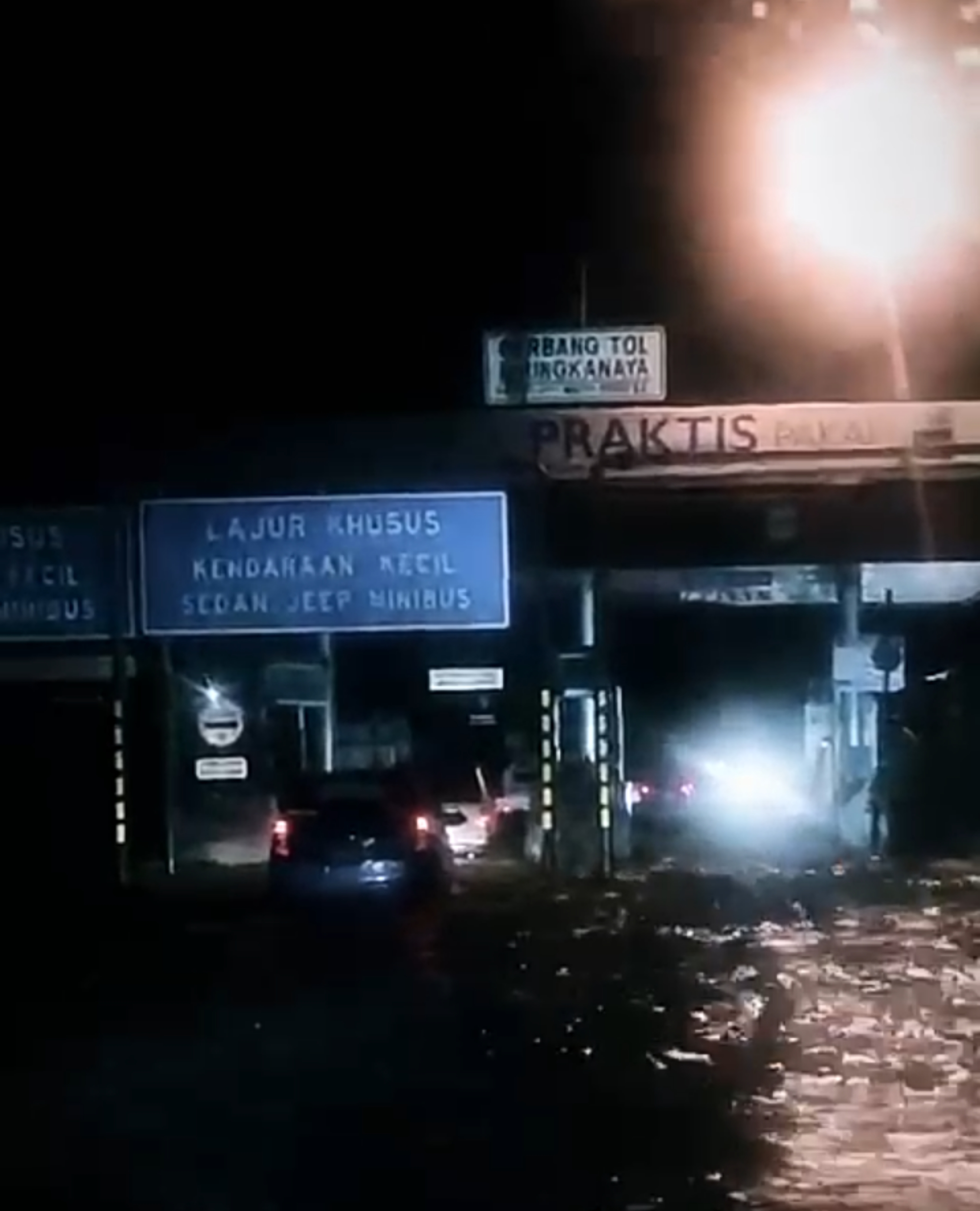 Banjir jugat tak luput di gerbang Tol Insinyur Sutami, dari arah Bandara Internasional Sultan Hasanuddin Makassar, Biringkanaya.