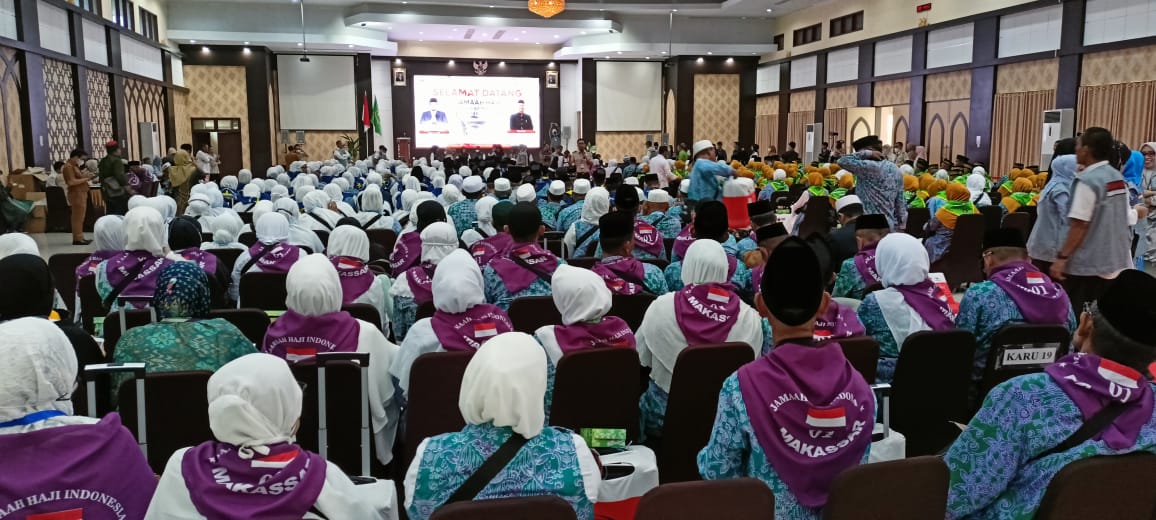 388 Jemaah Haji Kloter Pertama Asal Kota Makassar diterima di Asrama Haji Sudiang Makassar, Selasa pagi (22/5/2023). @Jejakfakta/dok Humas Kemenag