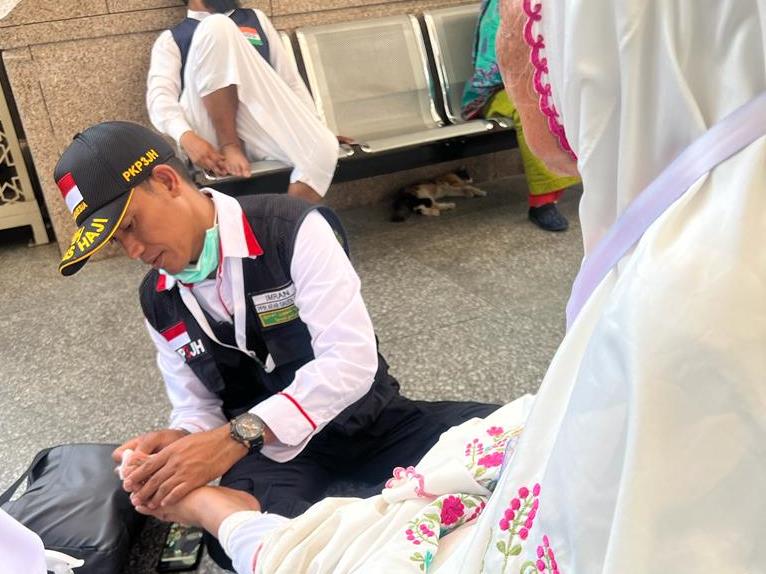 Tim PKP3JH memberikan pertolongan kepada Jemaah dengan memberikan pelembab untuk telapak kaki guna mencegah kaki kering dan melepuh di wilayah Masjid Nabawi. Jejakfakta/dok. Humas Kemenag