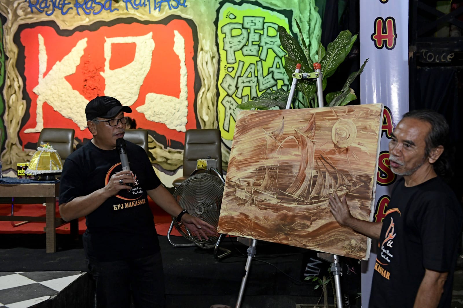 Wali Kota Makassar 2004 - 2014 Ilham Arief Sirajuddin bersama maestro pelukis tanah liat dunia, Zaenal Beta saat menghadiri Peringatan HUT Ke-17 KPJ Makassar, di Taman Macan, Jumat malam, Sabtu (29/7/2023). @Reza Arifuddin