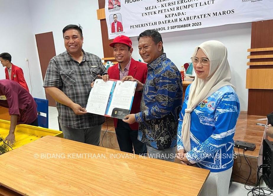 Pemerintah Kabupaten Maros terima kursi dan meja kerja ergonomis untuk petani rumput laut hasil inovasi Universitas Hasanuddin. Penyerahan di Balai Diklat Pengolahan Perikanan Kecamatan Bontoa, Kabupaten Maros, Sabtu (2/9/2023).