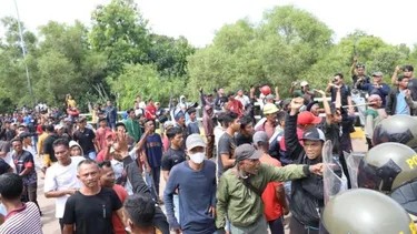 Kamis (7/9/2023) pagi, aparat gabungan kepolisian, Satpol PP dan TNI memaksa masuk ke kampung adat Rempang Galang untuk memasang patok batas MEG.