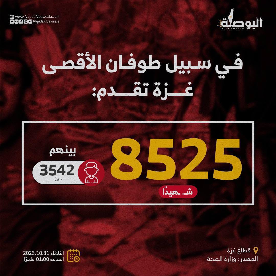 Gaza - Kementerian Kesehatan Palestina, Selasa (31/10/2023), mengumumkan, sebanyak 8.525 rakyat Palestina tewas di Jalur Gaza akibat serangan Israel. Tercatat 3542 dari total korban meninggal tersebut adalah anak-anak.