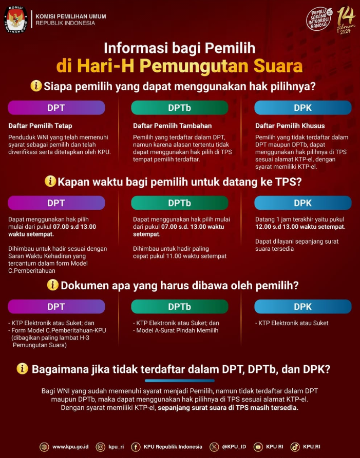 "Jika sampai hari pemungutan suara, pemilih dalam DPT dan DPTb (Daftar Pemilih Tambahan) belum menerima surat pemberitahuan, yang bersangkutan tetap bisa menggunakan hak pilihnya dengan membawa KTP el atau surat keterangan (Suket) yang diterbitkan oleh Dinas Kependudukan dan Catatan Sipil," kata anggota KPU RI Idham Holik dalam konferensi pers, Senin (12/2/2024), menjelaskan contoh kasus bila pemilih belum menerima formulir C6.