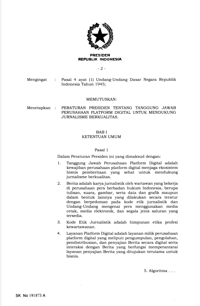 Presiden, melalui Perpres Publisher Rights, menyebut pemerintah ingin memastikan jurnalisme di tanah air tumbuh berkualitas dan jauh dari konten negatif. Pemerintah juga ingin memastikan keberlanjutan industri media nasional.