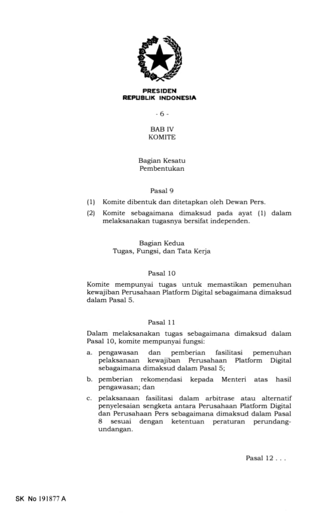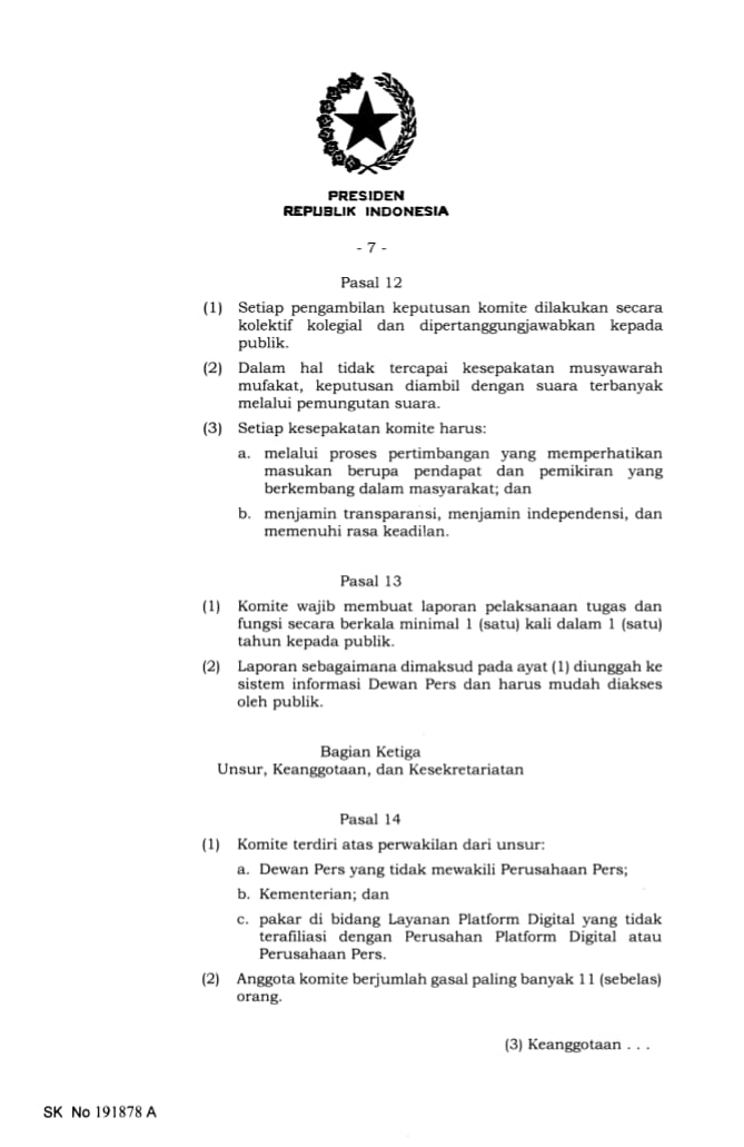 “Setelah mulai ada titik kesepemahaman, mulai ada titik temu, ditambah lagi dengan Dewan Pers yang mendesak terus, perwakilan perusahaan pers dan perwakilan asosiasi media juga mendorong terus akhirnya kemarin saya meneken Perpres tersebut,” kata Presiden.