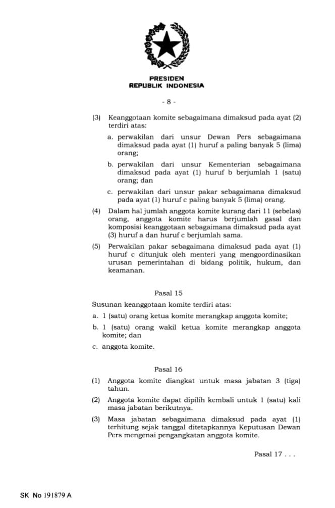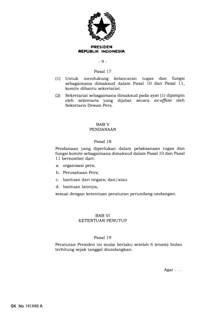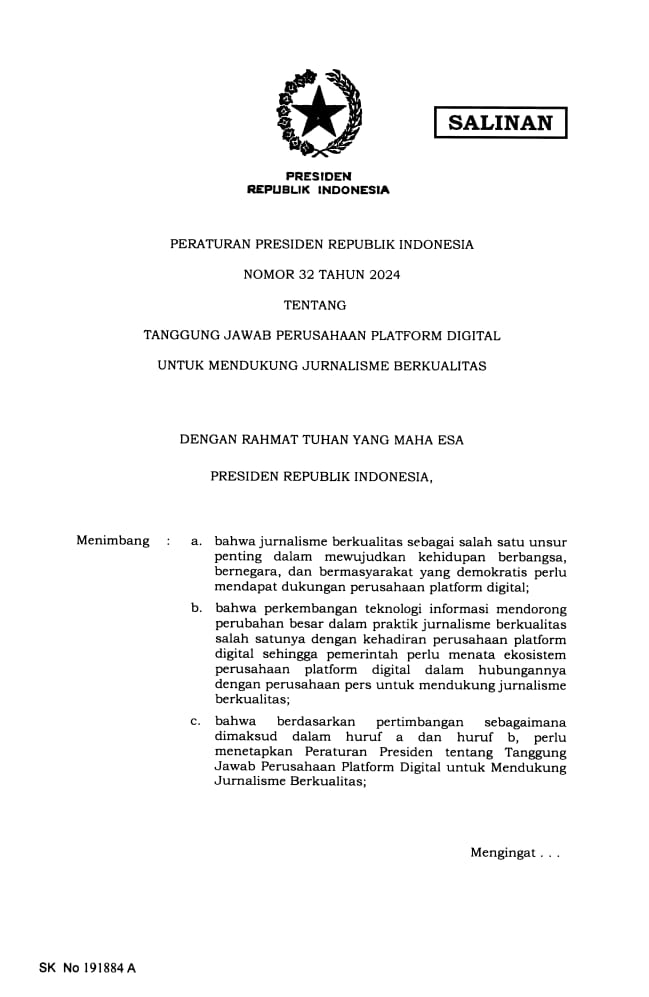 Presiden menyatakan, penerbitan peraturan yang dapat diakses pada laman JDIH Sekretariat Kabinet ini merupakan salah satu upaya pemerintah untuk mewujudkan jurnalisme yang berkualitas serta keberlanjutan industri media konvensional di tanah air.