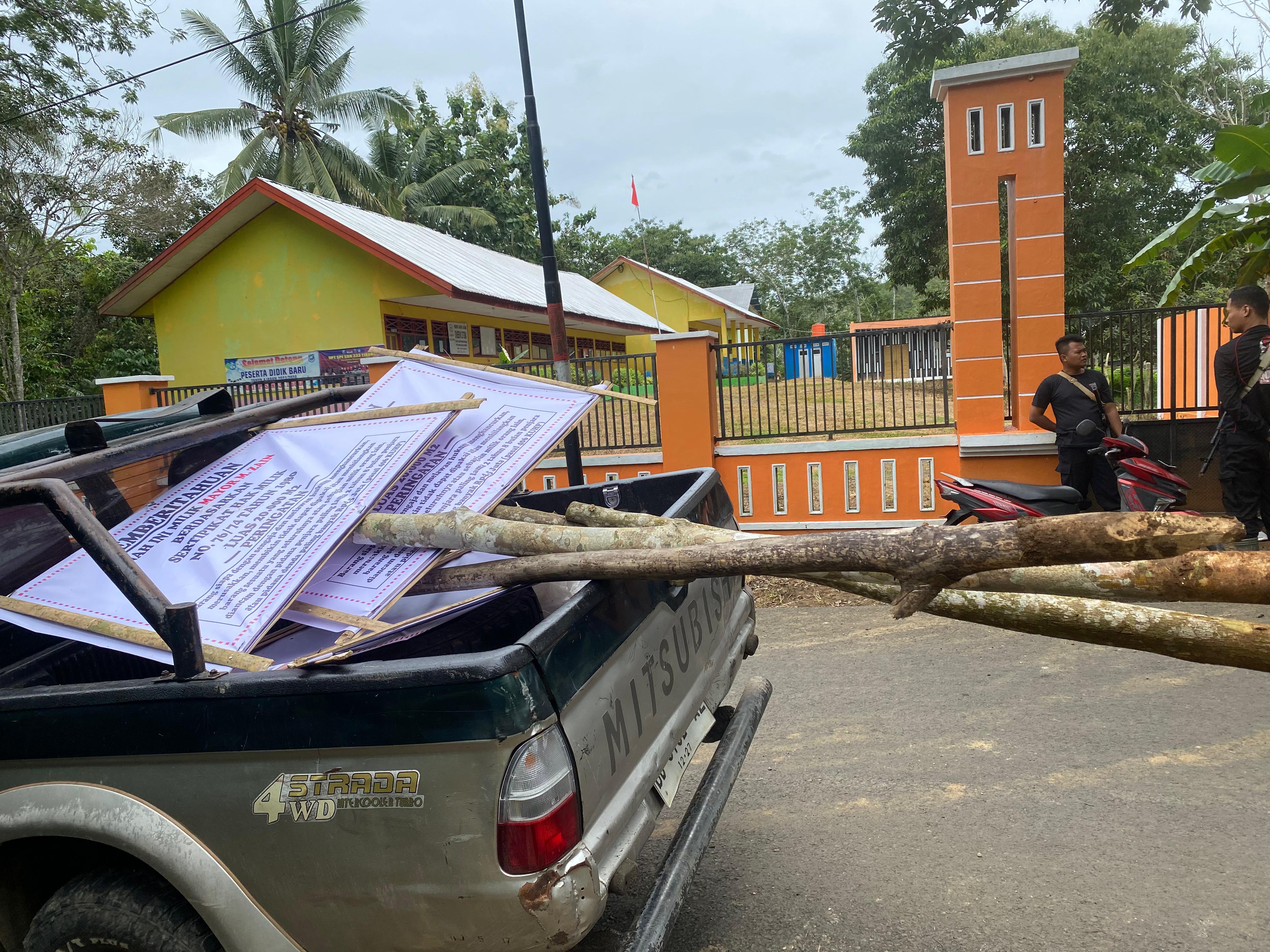 Pihak keamanan PT. Lonsum dibantu aparat Brimob mencabut papan bicara hak kepemilikan tanah warga di Desa Bonto Mangiring, Tamatto, Swatani dan Balleanging Bulukumba, Minggu (9/3/2024). @Jejakfakta/dok. LBH Makassar