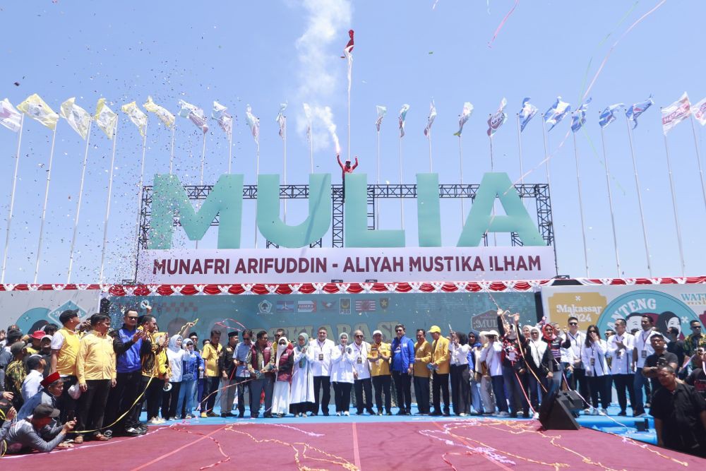 Jejakfakta, Makassar - Nuansa keberagaman mewarnai panggung deklarasi bakal kontestan Pilwali Makassar 2024 Munafri Arifuddin-Aliyah Mustika (Mulia) di Anjungan Bugis, Pantai Losari, Kota Makassar, Sulsel, Kamis (29/8/2024).