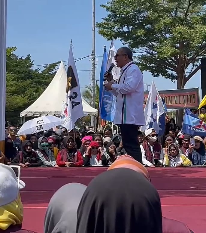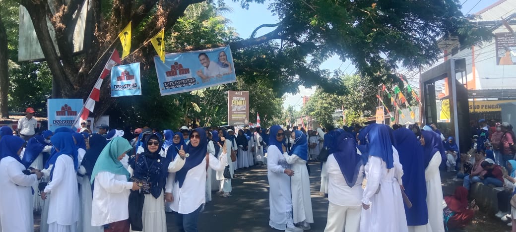 Tampak emak-empak kompak mengenakan putih-putih dengan kerudung biru. Sesekali mereka memekikkan tagline Mulia.(*)