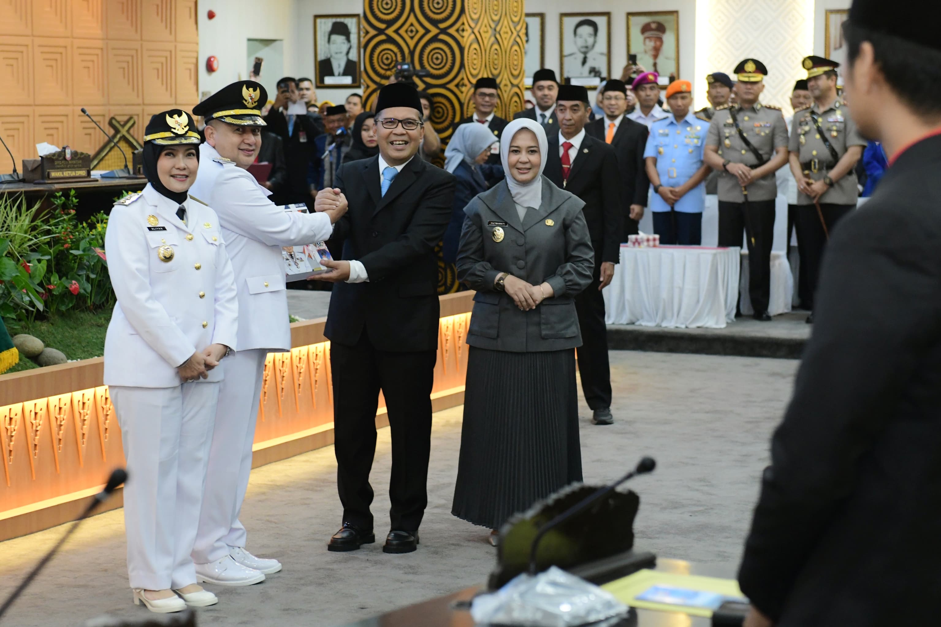 Momen serah terima jabatan dari mantan Wali Kota Makassar Danny Pomanto didampingi mantan Wakil Wali Kota Makassar Fatmawati Rusdi kepada Wali Kota Makassar Munafri Arifuddin dan Wakil Wali Kota Makassar Aliyah Mustika Ilham di kantor DPRD Makassar, Jl AP Pettarani, Makassar, Senin (3/3/2025) . Sertijab ini dirangkaikan pembacaan visi dan misi. @Jejakfakta/Reza Arifuddin