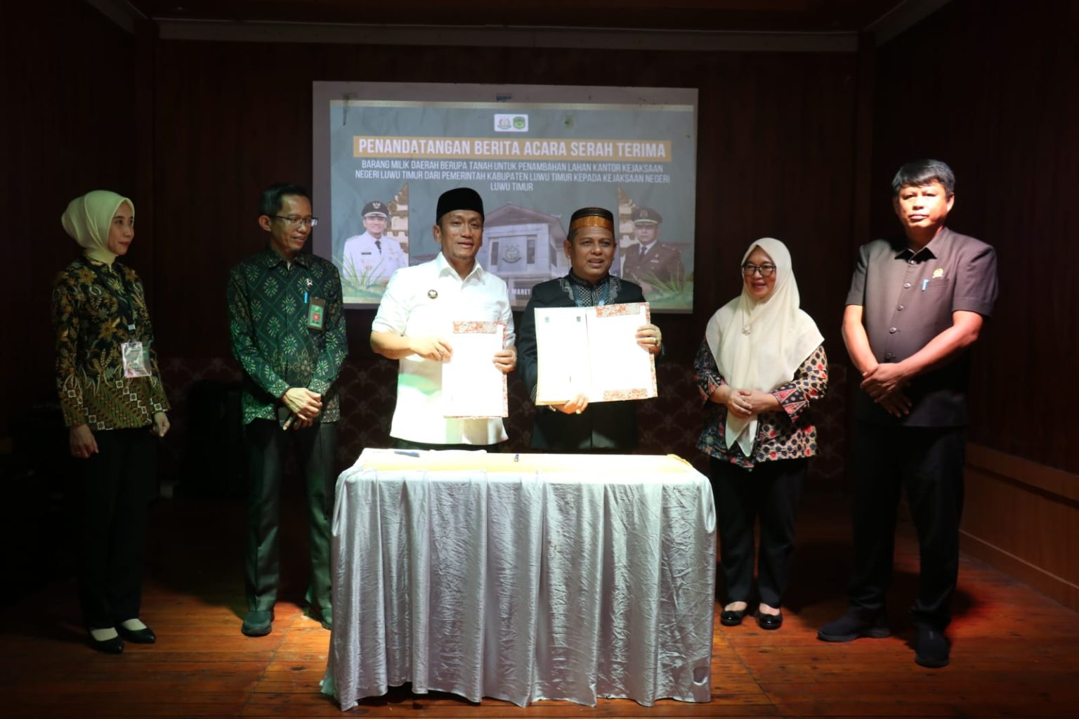 Bupati Luwu Timur Irwan Bachri Syam, bersama Kepala Kejaksaan Negeri (Kajari) Luwu Timur, Budi Nugraha, melakukan penandatanganan berita acara serah terima barang milik daerah berupa tanah untuk penambahan lahan Kantor Kejari Luwu Timur, , Kamis (20/03/2025). @Jejakfakta/dok. Humas Pemkab Lutim